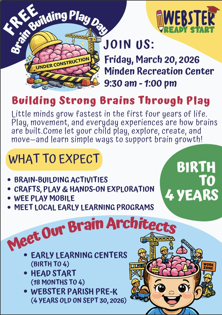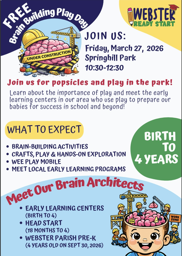 Webster Ready Start is excited to help provide a quality education to Webster Parish children from birth to 5 years. We believe that early childhood education is critical to a child’s development, especially the years before they reach kindergarten. Our goal at Webster Ready Start is to provide each child with the best education possible so they can enter kindergarten well-prepared and are #WeAreWebsterReady!